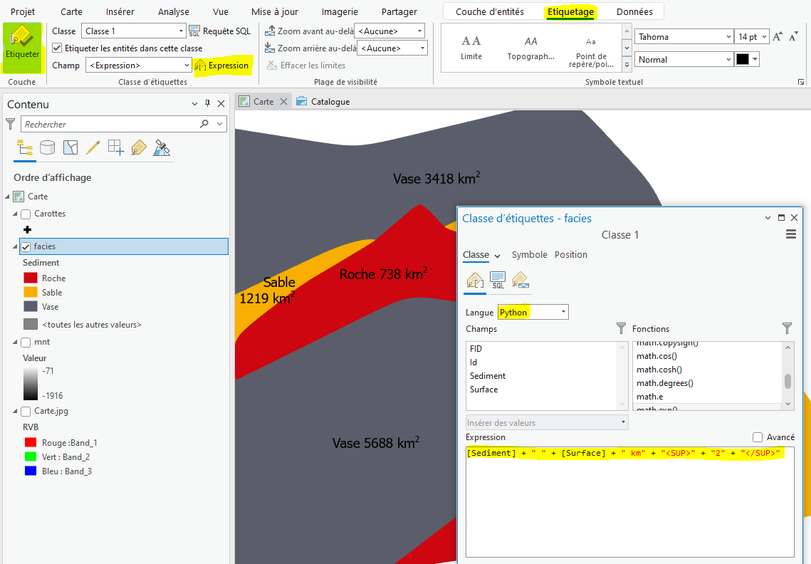 Expression (python) : [sediment] + “ ” + [Surface] + “km” + “\u00B2”