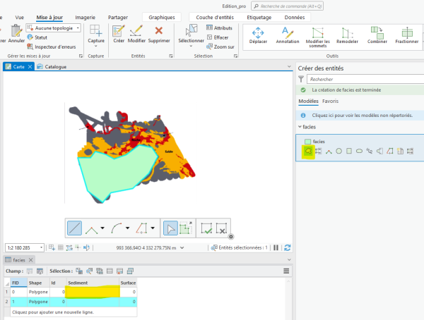 - Pour créer des entités sur un shapefile, ouvrez la fenêtre “Mise à jour” et cliquez sur l'icône “Créer”. Dans la fenêtre “Créer des entités” qui apparaît, sélectionnez le modèle “facies” et utilisez l'outil “Polygone” pour numériser.