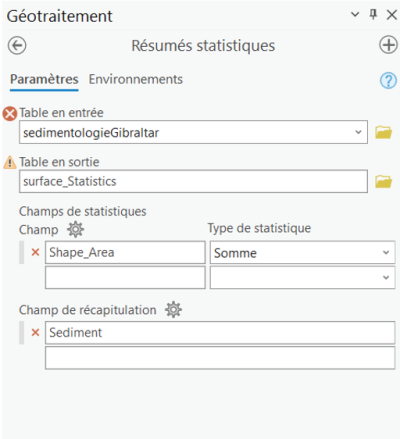 Ajouter à la table attributaire de la carte sédimentaire numérisée (couche vectorielle) un champ surface. Utiliser ensuite l’outil de Géotraitement “Résumé statistiques” pour calculer la surface totale occupée par les trois facies sédimentaires. Visualiser les résultats sous la forme d’un graphique (clic droit sur la table – Créer un diagramme).