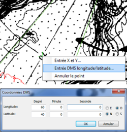 Cette méthode est à utiliser lorsque les lignes (ou croisillons) des latitudes et longitudes sont présentes sur la carte. Avec l'outil Ajouter des points de contrôle il suffit de se mettre sur chaque croisement puis clic gauche immédiatement suivi d'un clic droit et Entrée DMS longitude/latitude.
