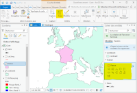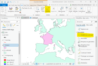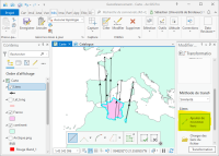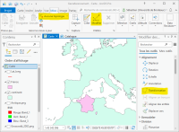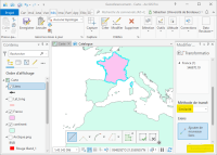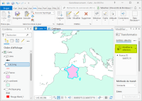 Créez une nouvelle carte et chargez les couches “France.shp” et “continent.shp”. Pour une raison de géodésie erronée la couche “France.shp” est mal positionnée. Vous allez corriger ce problème par l'alignement. Sous l'onglet Mise à jour sélectionnez 'Aucune topologie” et “Modifier”. Dans la fenêtre “Modifier les entités” sélectionnez “Transformation