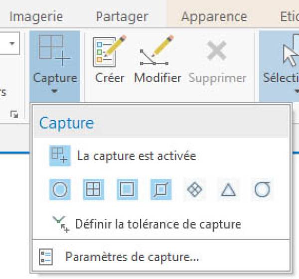 La barre d'outils Capture : permet de créer des entités qui se connectent par magnétisme les unes aux autres afin que vos modifications soient plus précises.
