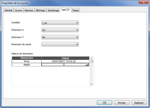 Le raster crée est un raster multi-dimensionnel. Le paramètre (température ou salinité) peut être affiché en fonction de la latitude, de la longitude et de la profondeur. Dans les Propriétés de la couche sous l'onglet NetCDF vous pouvez faire varier la profondeur.