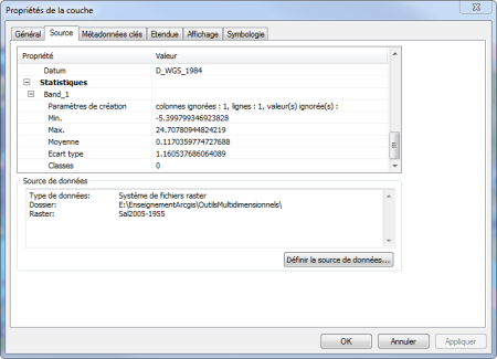 Pour chaque raster les statistiques permettent d'avoir directement les valeurs de pixel minimale et maximale, ainsi que la moyenne et l'écart type des valeurs de pixel calculées. Les statistiques sont accessibles sous l'onglet Source des propriétés de la couche.