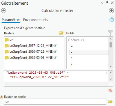 A l'aide des MNE de 2017, 2020 et 2023 et de la calculatrice raster, comparez l'évolution du terrain entre 2017 et 2020 et entre 2020 et 2023.