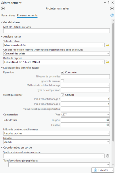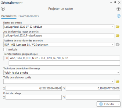 Afin de résoudre le problème, nous allons re-projeter le jeu de données de 2020. Allez dans “Geotraitement > Projeter” et projetez dans le système de coordonnées RGF_93_Lambert_93 et ajoutez la transformation géographique NTv2 comme sur l'image ci-dessous. Afin d'être sûr qu'il est parfaitement aligné avec vos autres rasters, allez dans “Environnements” et précisez que le 2017 ou 2023 servira de “Raster de capture” ⇒ De cette manière, tous vos pixels seront parfaitement alignés.
