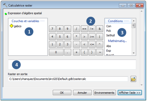- Zone Expression de la boîte de dialogue. Vous pouvez utiliser les couches de la Table des matières ou saisir le nom de chemin complet du jeu de données raster sur le disque (ex : “slope(c:\spatial\elevation)”).