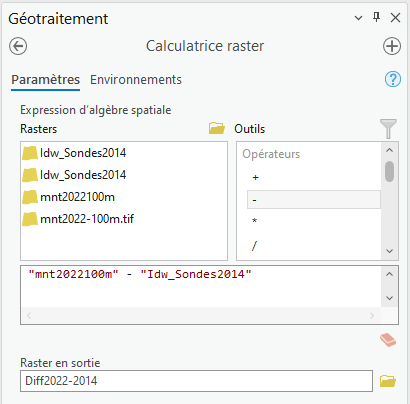 La Calculatrice raster est un outil puissant qui permet d'exécuter des opération mathématiques sur des rasters et entre les rasters. Ici nous allons soustraire deux rasters : 2021 - 2014.