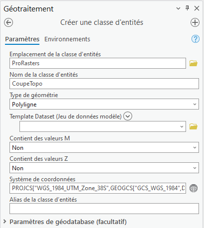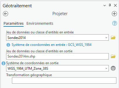 Avant toute analyse spatiale, il est indispensable de projeter les données vectorielles, afin d’obtenir un référentiel XYZ dans la même unité, ici en mètres. La transformation du système de coordonnées d’un élément s’effectue avec le géotraitement - Projeter. Le système géodésique utilisé sera le WGS_1984_UTM_Zone_38S.