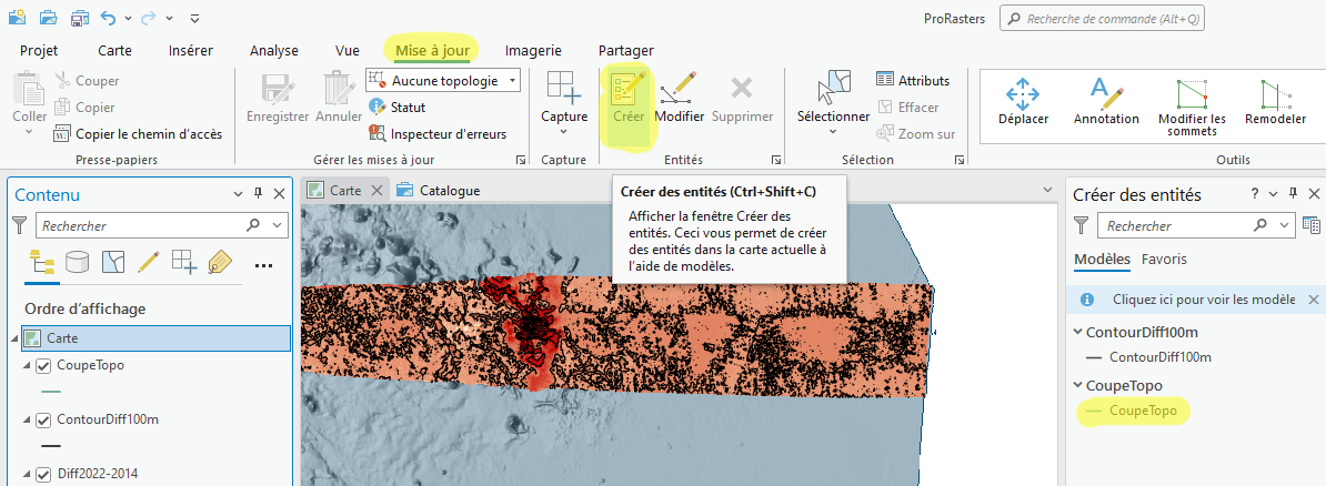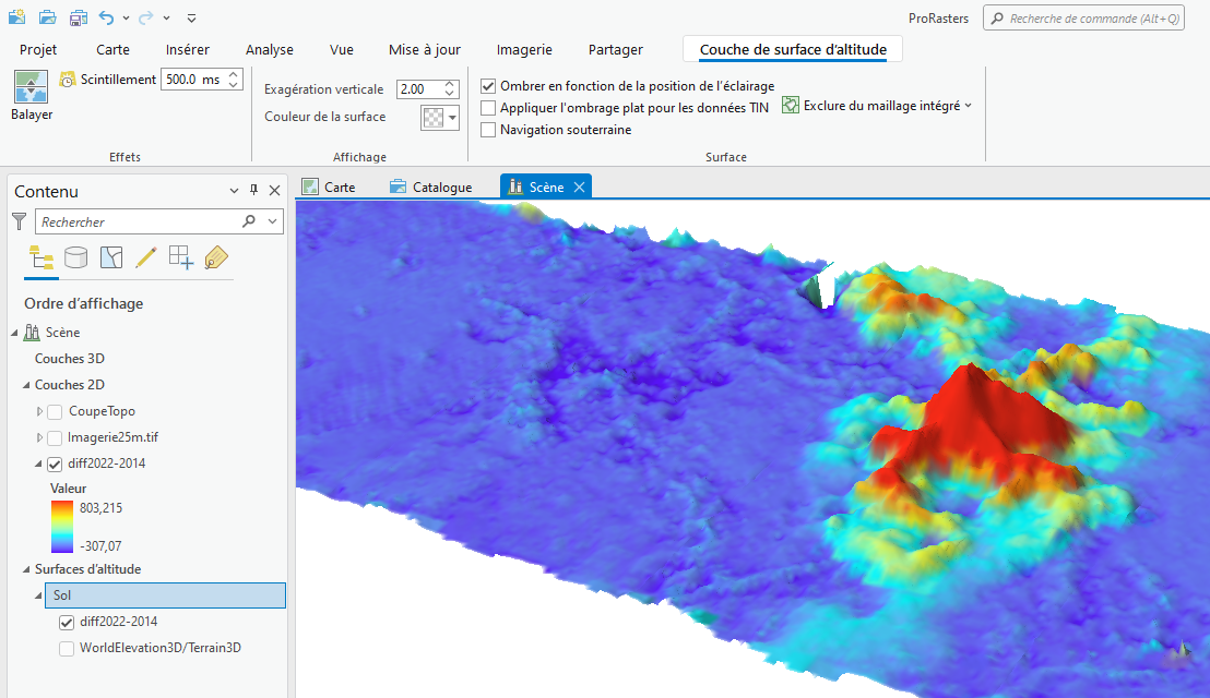 Chargez dans Surface d'altitude - Sol le raster de différentiel bathymétrique 2021-2014. Chargez dans Couches 2D les différentes couches que vous souhaitez visualiser en 3D. Ces couches peuvent être des points, polylignes, polygone ou rasters. Ici vous allez pouvoir charger la coupe topo, le raster de différentiel bathymétrique mais également l'imagerie du fond (Imagerie25m.tif).