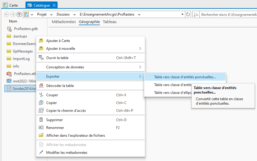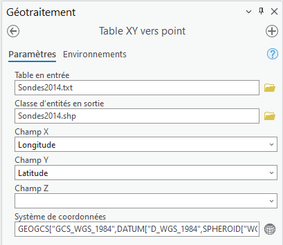 Le fichier de sondes au format texte doit dans un premier temps être convertit en fichier de formes : Exporter - Table vers classe d'entités ponctuelles.