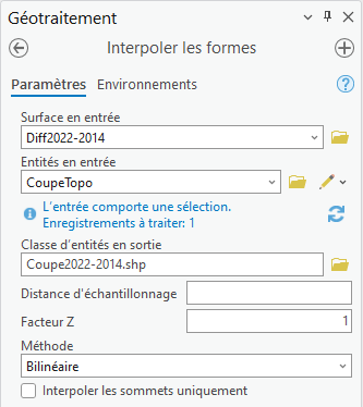 Afin de pouvoir tracer le profil cette polyligne doit être transformée en ligne 3D. La 3e dimension, ici le différentiel bathymétrique, doit être intégré à la ligne par le Géotraitement - Interpoler les formes.