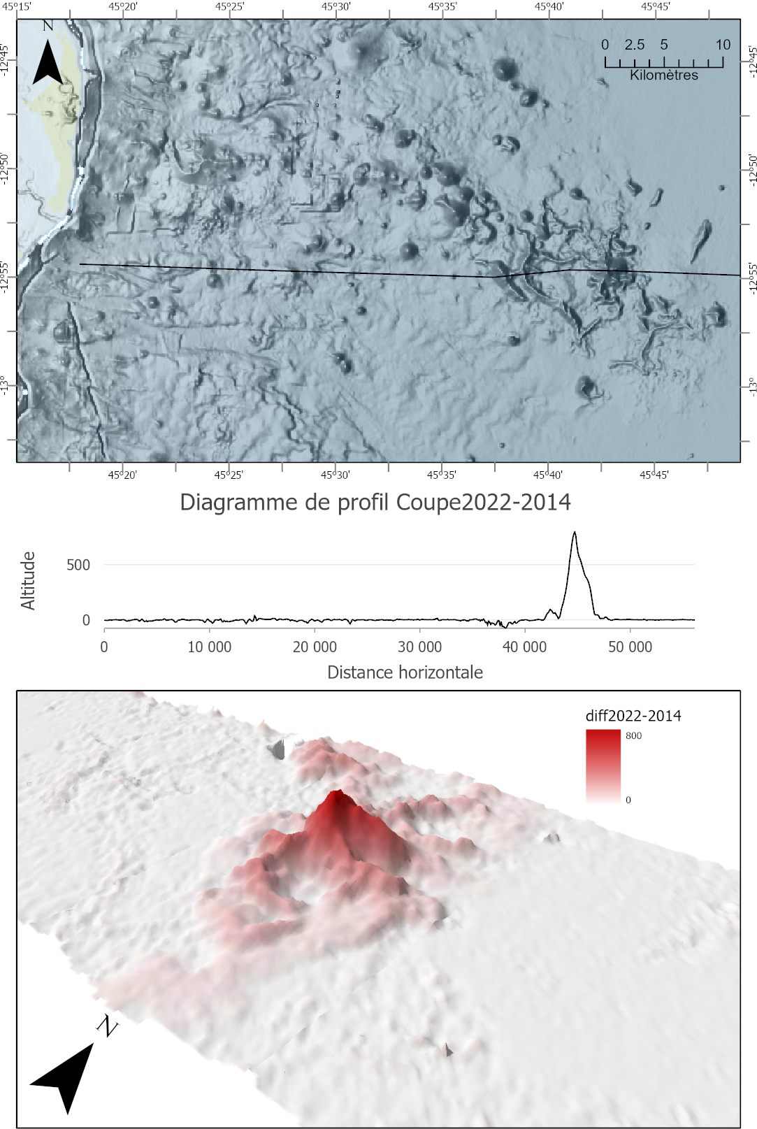 L'objectif de cette séance et de traiter et créer des rasters bathymétriques des pentes sous-marines volcaniques de Mayotte afin d'évaluer l'évolution morpho-bathymétrique de la région entre les années 2014 et 2021.