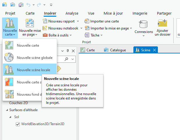 Nous allons maintenant basculer en vue 3D afin d'améliorer la visualisation des rasters bathymétriques. Commencez par créer une nouvelle scène locale.